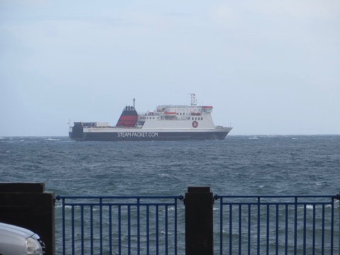 Wir warten auf die Manannan der Steam-Packet Company. Als das Schiff endlich da ist, gehen die angekommenen Fuss-Passagiere (die Mehrheit der Passagiere sind mit dem Auto unterwegs) zum Terminal, wo wir warten.
