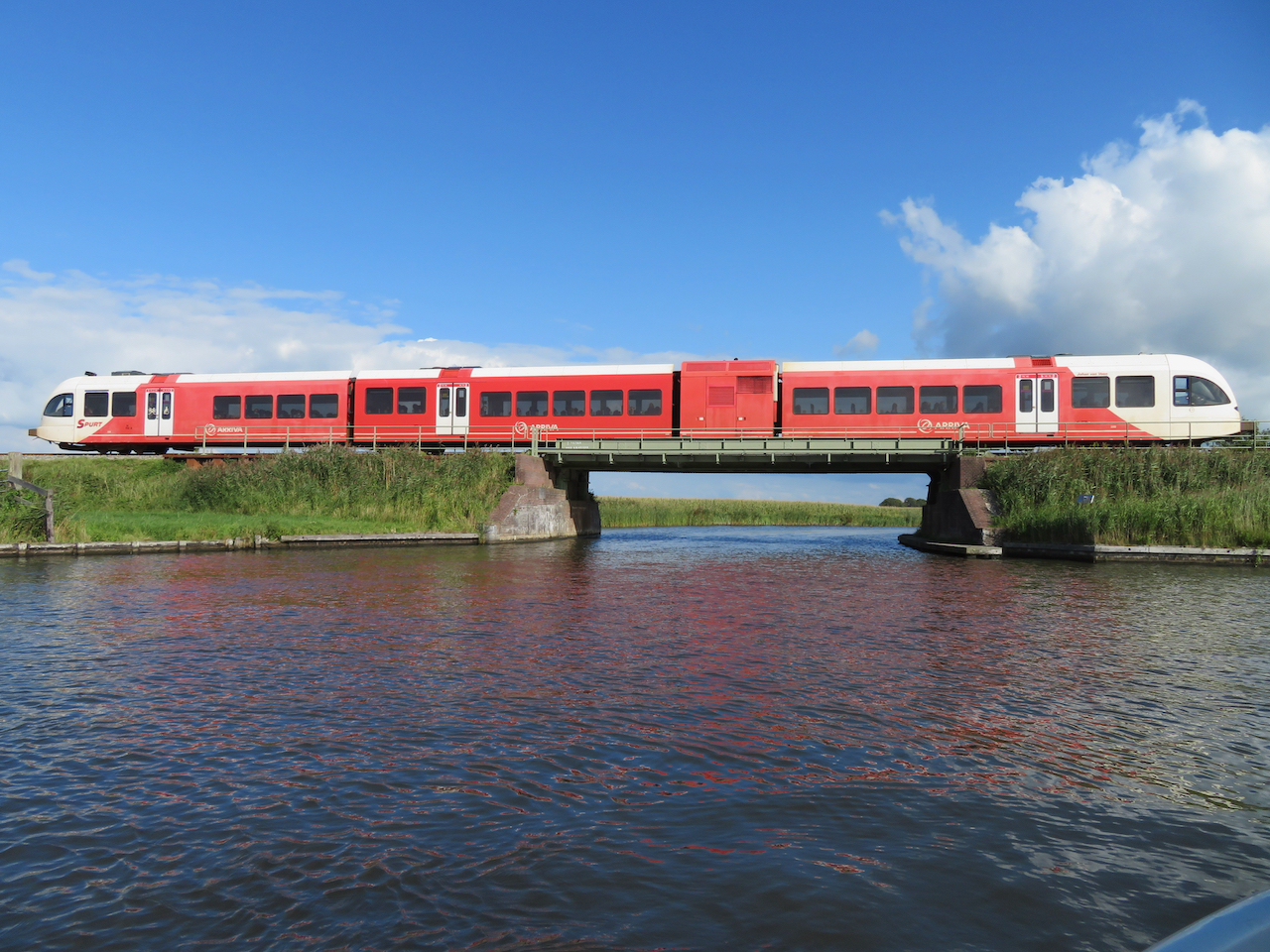 Weiter Richtung Osten geht's durch das Burgumer Meer. Mitten in diesem See zweige ich ab Richtung Norden. An der Spoorbrug, wo der Kanal die Strecke Leeuwarden - Groningen kreuzt, könnte ich lange auf einen Zug warten. Wegen Bauarbeiten fährt heute (Sonntag) keiner und die Reisenden werden mit Bahnersatzbussen transportiert.