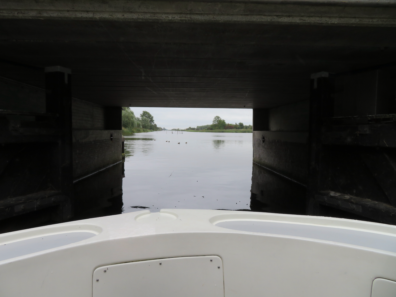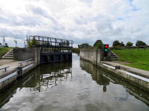 Um ins Lauwersmeer hinein oder aus diesem wieder herauszufahren hat man drei Möglichkeiten: Es gibt eine Schiffs-Schleuse im Abschlussdeich zur Waddenzee etwas östlich der Cleveringsluizen. Zum Anschluss ins Binnenland hat das Lauwersmeer zwei Arme, einen südlichen und einen südöstlichen. Gestern bin ich über den südlichen hereingekommen und heute will ich über den südöstlichen hinausfahren.