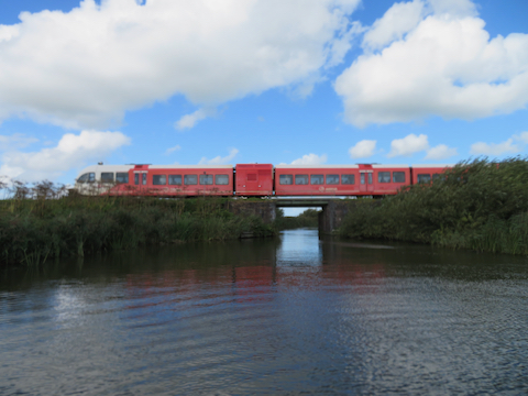 Jetzt kreuzt mein Kanal wieder mal eine Bahnlinie. Es handelt sich um die Strecke Leeuwarden - Groningen. Heute ist Werktag, da fahren die Züge wieder.