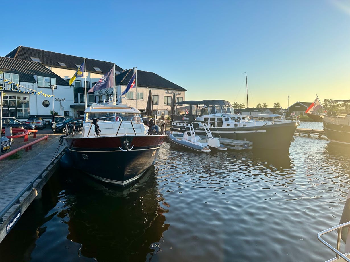 Wir haben uns bereits rechtzeitig im Restaurant Oostergoo in Grou angemeldet. So können wir den private Hafen des Restaurants benützen. Natürlich nehmen wir dort auch das Abendessen ein. Nach dem Essen wird das auch gleich zu unserem Liegeplatz für die Nacht. Unser Boot ist das grössere mit dem schwarzen Rumpf in der rechten Bildhälfte.